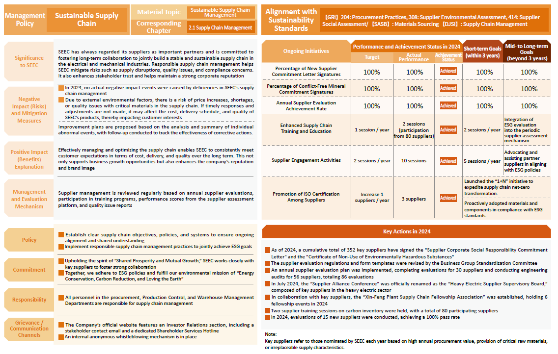 Each year, Shihlin Electric reviews and adjusts its materiality analysis framework in alignment with the latest GRI Standards, identifying key sustainability topics that not only inform this report but also serve as a foundation for the company’s long-term sustainability goals and strategies. The company adheres to the GRI 3: Material Topics 2021 disclosure principles and evaluates each topic based on: The actual or potential positive and negative impacts of Shihlin Electric on the external environment, economy, and people (including human rights), and The actual or potential impact of sustainability issues on Shihlin Electric’s business continuity. This approach reflects the principle of Double Materiality, enabling the company to better understand the significance of its internal and external impacts. To identify relevant sustainability issues, the company compiles a comprehensive list of topics that may affect business continuity (including risks and opportunities) and are of concern to stakeholders (including regulatory expectations). References include: - International sustainability frameworks and standards (GRI, SASB, TCFD) - The United Nations Sustainable Development Goals (SDGs) - ESG rating agencies (e.g., MSCI) - Taiwan’s regulations on sustainability report preparation and disclosure - Stakeholder concerns - Industry-specific guidelines and best practices - Recommendations from external ESG consultants and experts After consolidating issues relevant to Shihlin Electric, each topic is assessed for its actual and potential impact both externally and internally. In parallel, the company actively conducted a stakeholder engagement survey to understand their level of concern regarding Shihlin Electric’s sustainability issues. Over 60 questionnaires were collected, and the survey results were incorporated as part of the materiality evaluation parameters. In 2024, nine topics exceeded the materiality threshold and were identified as key material topics: 1.Corporate Governance and Integrity 2.Sustainable Supply Chain Management 3.Operational and Financial Performance 4.Product Quality and Safety 5.Opportunities in Clean Technology 6.Information Security and Management 7.Climate Change Risk Response 8.Employee Rights and Benefits 9.Occupational Health and Safety For each material topic, the company has established corresponding management approaches based on the level of impact on both business operations and stakeholder interests. These approaches serve as the core basis for developing related strategies and action plans. By implementing these management measures, Shihlin Electric aims to: Standardize internal operational processes Proactively respond to external expectations through concrete actions Continuously track, evaluate, and improve the effectiveness of its sustainability efforts Ensure alignment with stakeholder interests and long-term sustainable development goals