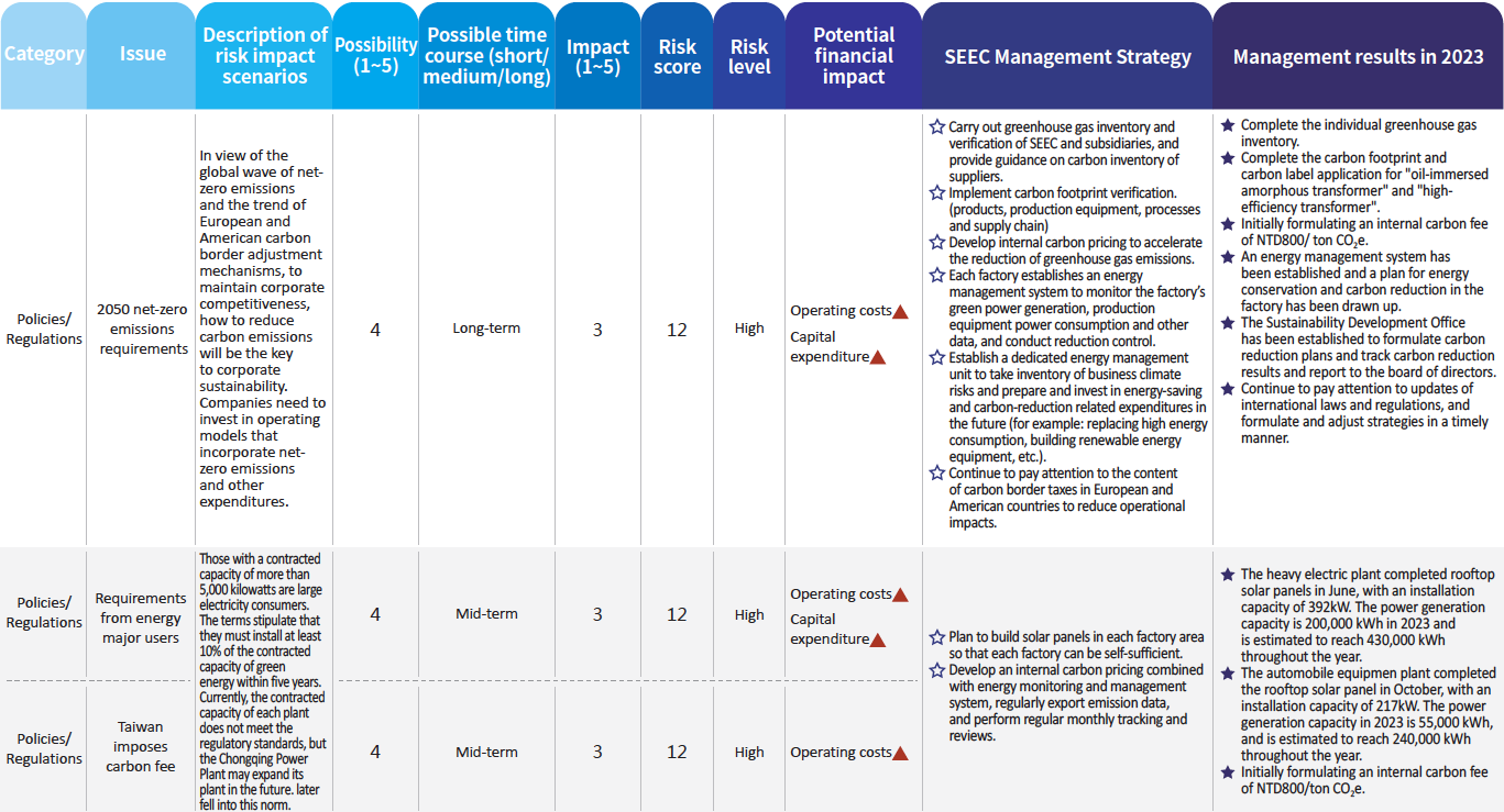 In 2023, the TCFD risk assessment included 15 risk issues such as the Carbon Border Adjustment Tax, 2050 Net-Zero Emission Requirements, Energy Major User Requirements, Water Usage Fees, Mandatory Reporting Requirements, and Carbon Tax Levies. TCFD opportunities included 9 items such as low-carbon product and service opportunities, use of low-carbon energy, and entry into new markets. SEEC conducted impact scenario and risk level assessments from various perspectives including future business development strategies, green energy layout, stakeholder interests, and regulatory requirements. The company discussed the likelihood of occurrence, the expected timing of impact, and the extent of financial impact on SEEC for each risk and opportunity, and assigned risk scores accordingly. SEEC prioritized discussions on response strategies for the top 5 risks and 5 opportunities based on their impact levels, using these discussions as references for adjustments to operational strategies.